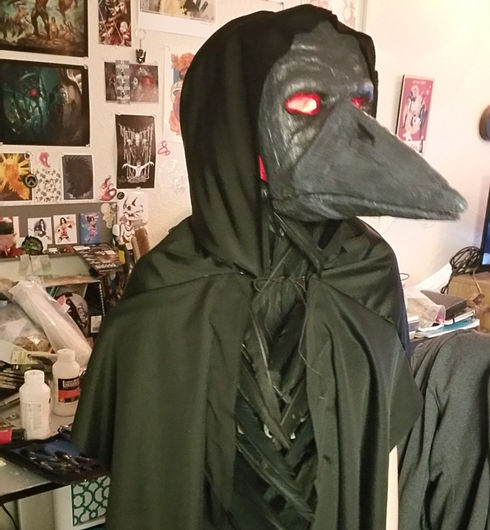 Here's a mask I made for class. The eyes glow red and the beak opens. Comes complete with cloak with feathers on the inside to give the appearance of a feathered monster.