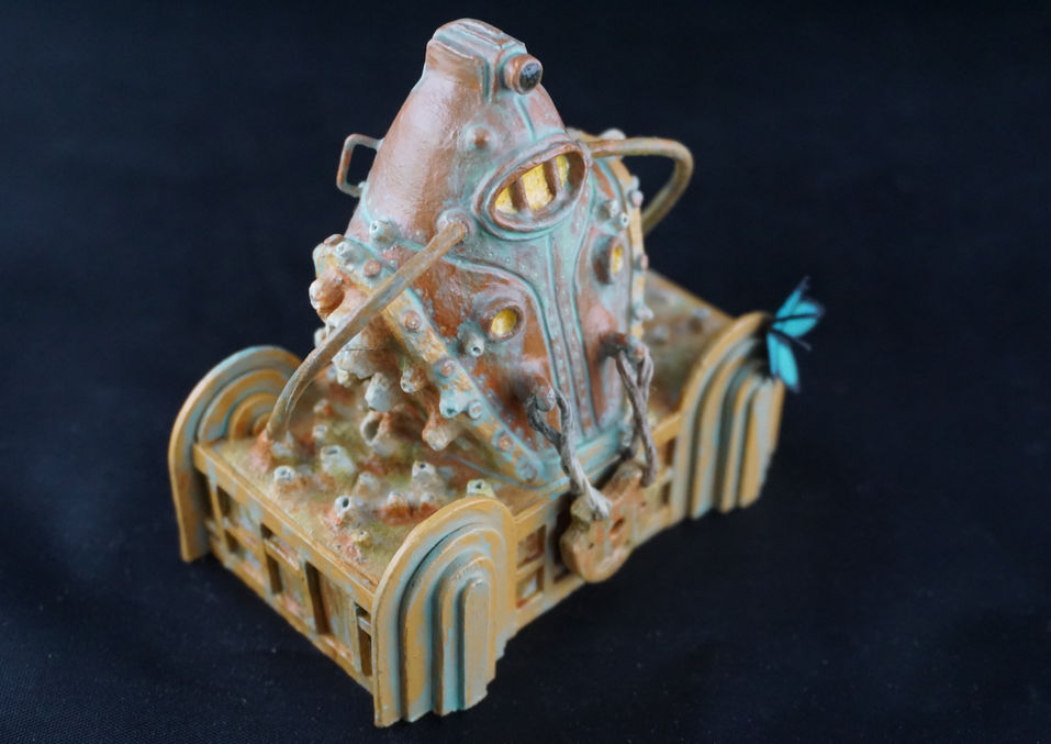 A sculpture of Subject Delta's helmet from the video game Bioshock 2.
